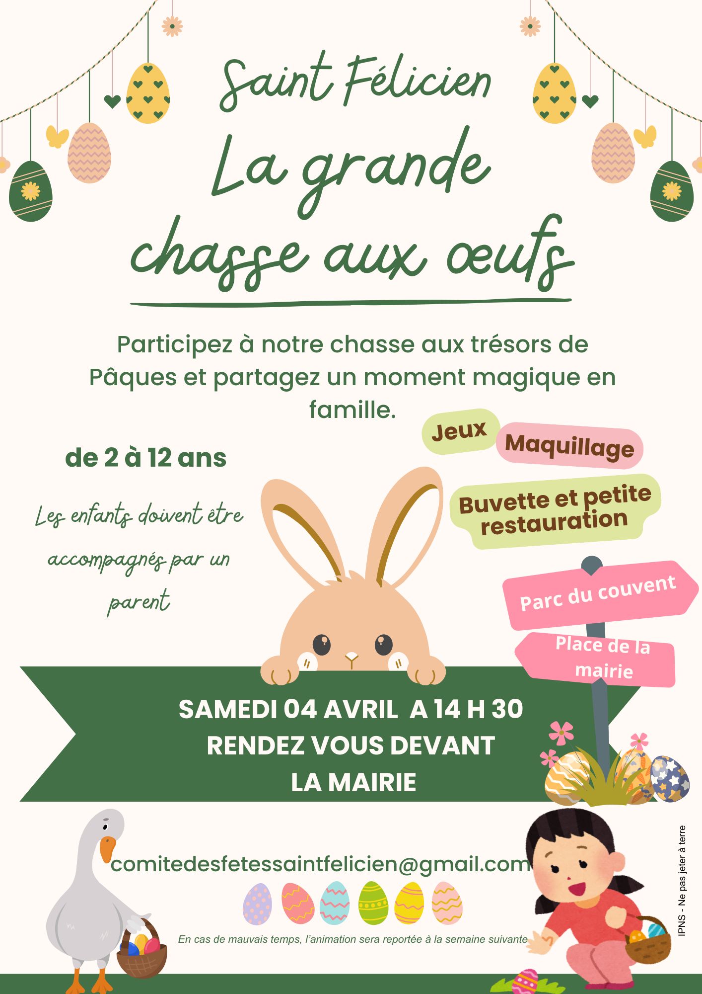 Samedi 4 avril (14h30) : La grande chasse aux oeufs –> Rendez-vous devant la mairie